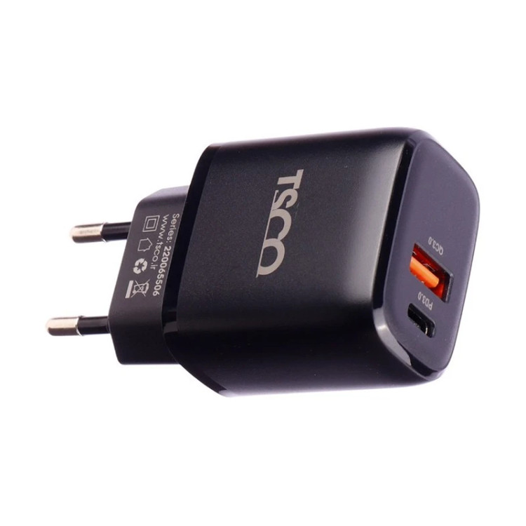 شارژر دیواری تسکو مدل TTC 65 از سری شارژر های دیواری برند تسکو در ابعاد 79.7x30x42.5 میلی متر به رنگ مشکی، جنس بدنه با مواد پلاستیکی مقاوم در برابر حرارت در زمان جریان کشی بالا،دو شاخه استاندارد برای استفاده در ایران و بهره مندی از تمام استانداردهای الکترونیکی وارد بازار شده، که درگاه خروجی آن دارای 2 پورت تایپ C و USB است و ولتاژ وروردی آن 240_100 ولتاژ است.
